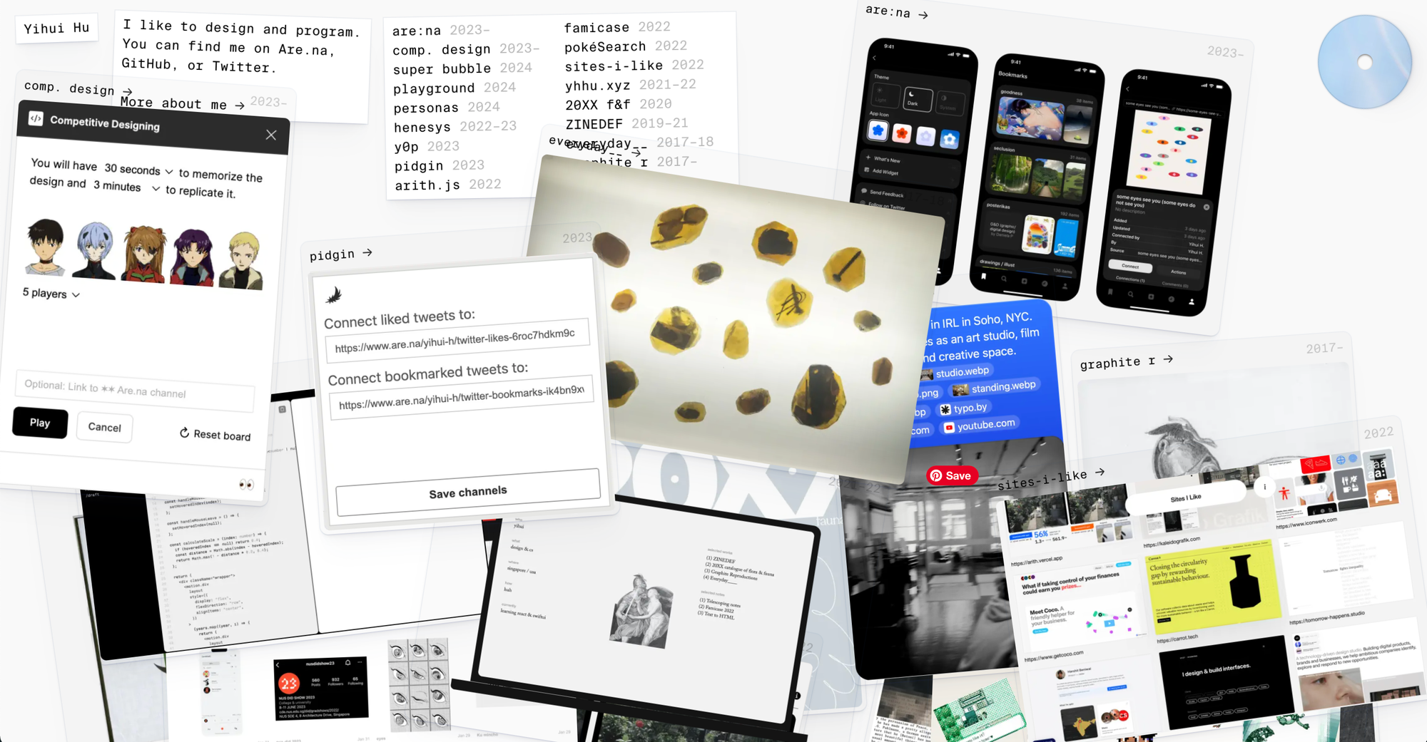 I discovered another yihui, and his website is playful and interactive. Check out his portfolio spread across the page like papers scattered on a table. You can shift through them to find what you're looking for.