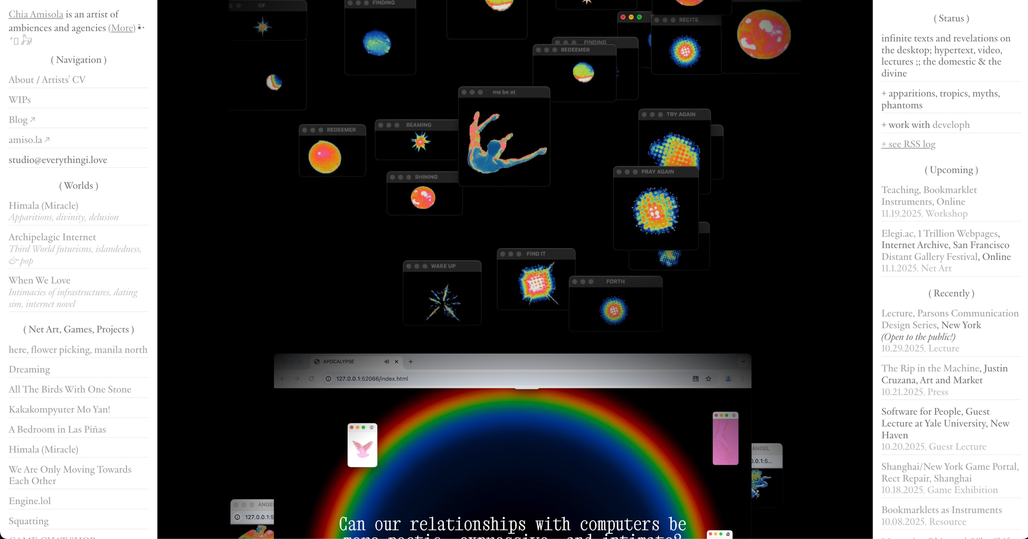 Chia is an internet artist, and her website reflects that. While the sidebars remain fixed, her website functions like an interactive gallery. Admire it like a work of art as you scroll down her page.
