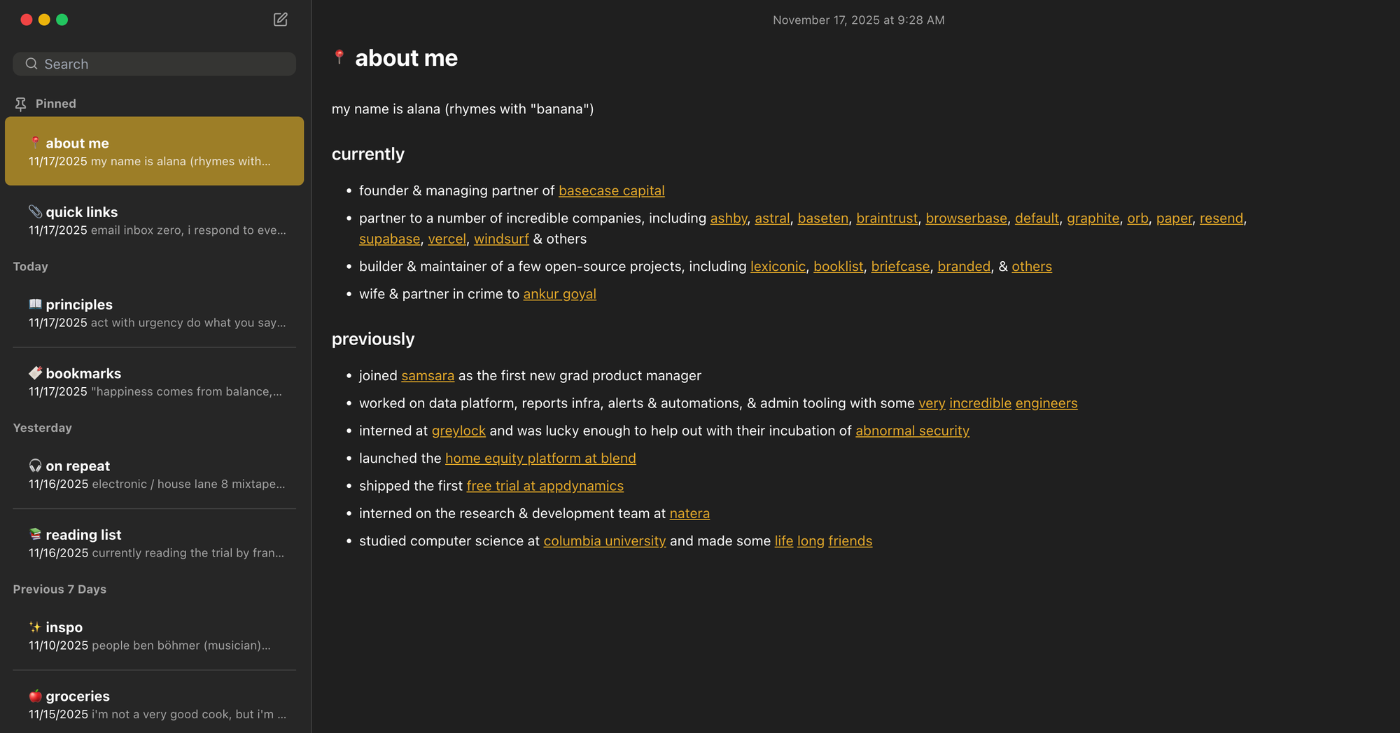 Some people live in their Apple notes. Alana took it literally, designing her website exactly like one. Each note contains a different list of her favourite things. You really don't have to overcomplicate your website.